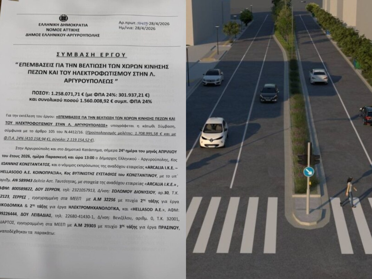 Σε τροχιά υλοποίησης μπαίνει ένα από τα σημαντικότερα έργα υποδομής για τον Δήμο Ελληνικού – Αργυρούπολης. Ο Δήμαρχος Γιάννης Κωνσταντάτος υπέγραψε τη σύμβαση για την ολική ανάπλαση της Λεωφόρου Αργυρουπόλεως με την ανάδοχο εταιρεία ARCALIA ΙΚΕ, παρουσία του Αντιδημάρχου Τεχνικών Υπηρεσιών, Θανάση Καλύβα.